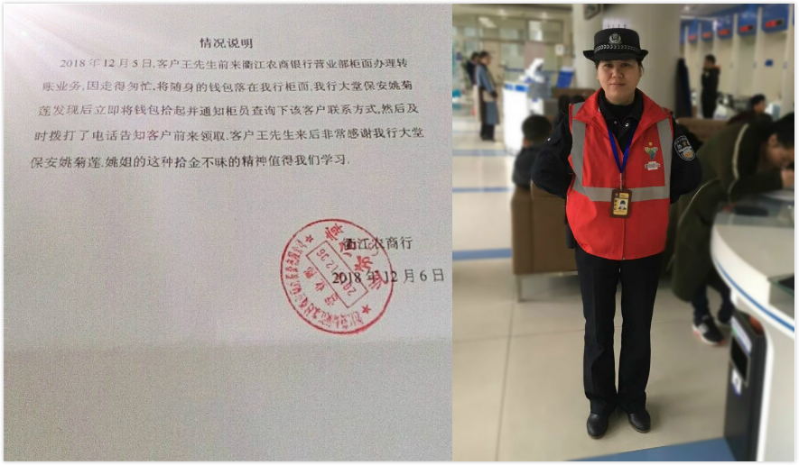 拾金不昧,是一种传统美德,是一个人高尚道德情操的体现。近日,浙江衢州星辉保安服务有限公司派驻衢江农商行队员姚菊莲,执勤时在银行柜面拾到一只皮夹,内有现金四千多元。姚菊莲立即将钱包交给营业厅柜员,寻找失主。失主王先生对姚菊莲表示感谢,农商行领导也对星辉队员赞不绝口,给予了很高的评价。