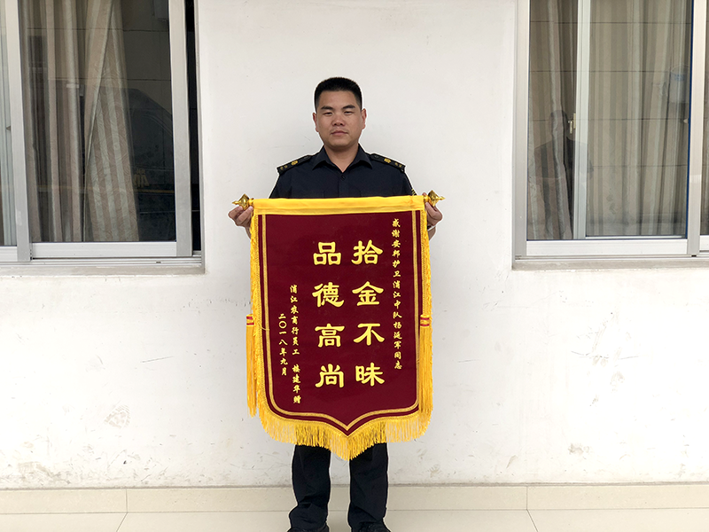9月11日上午,市民楼先生将一面印有“拾金不昧 品德高尚”的锦旗送到金华星辉公司义乌守押大队浦江农商行中队长手中,感谢该中队队员杨延军将手机归还失主。