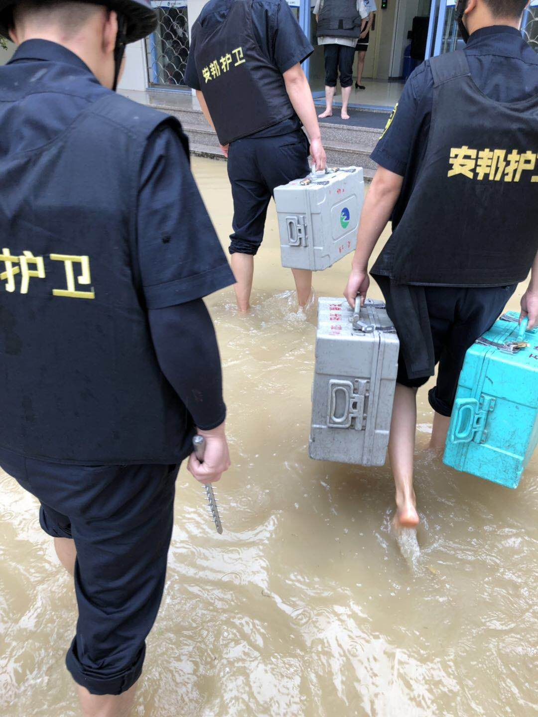 在查明积水路段安全通行路线后,押运员脱掉鞋子、卷起裤腿,荷枪实弹警戒护送,交接员手提重50斤、装有百万元人民币的款箱淌水步行。严格按照精细化操作规程执行,将款箱安全准时送达。
