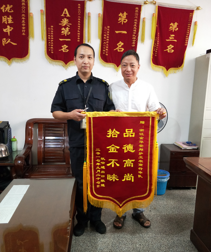 “非常感谢,谢谢。”10月9日上午,义乌凯啸进出口公司赵先生将“品德高尚、拾金不昧”的锦旗送到金华星辉义乌守押大队农商行中队办公室,嘴里还不停地说着感激的话,感谢该中队车长应伟忠将遗失的手机物归原主。(因应伟忠执行任务,由另一名车长代替接旗)