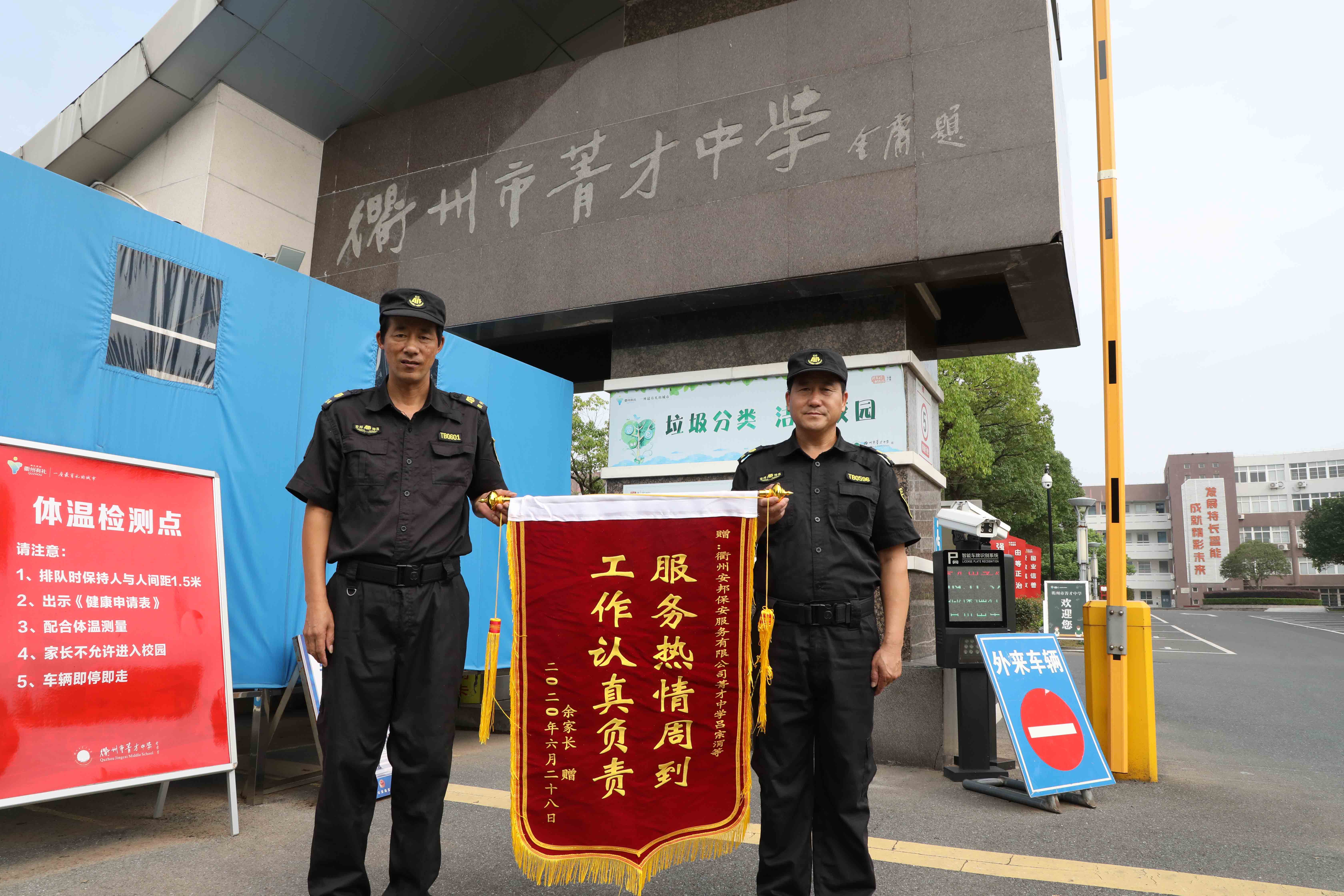 近日,一名学生家长将一面印有“服务热情周到 工作认真负责”字样的锦旗送到菁才中学保安室。浙江衢州星辉保安服务有限公司保安员吕宗伟作为代表接受了锦旗。