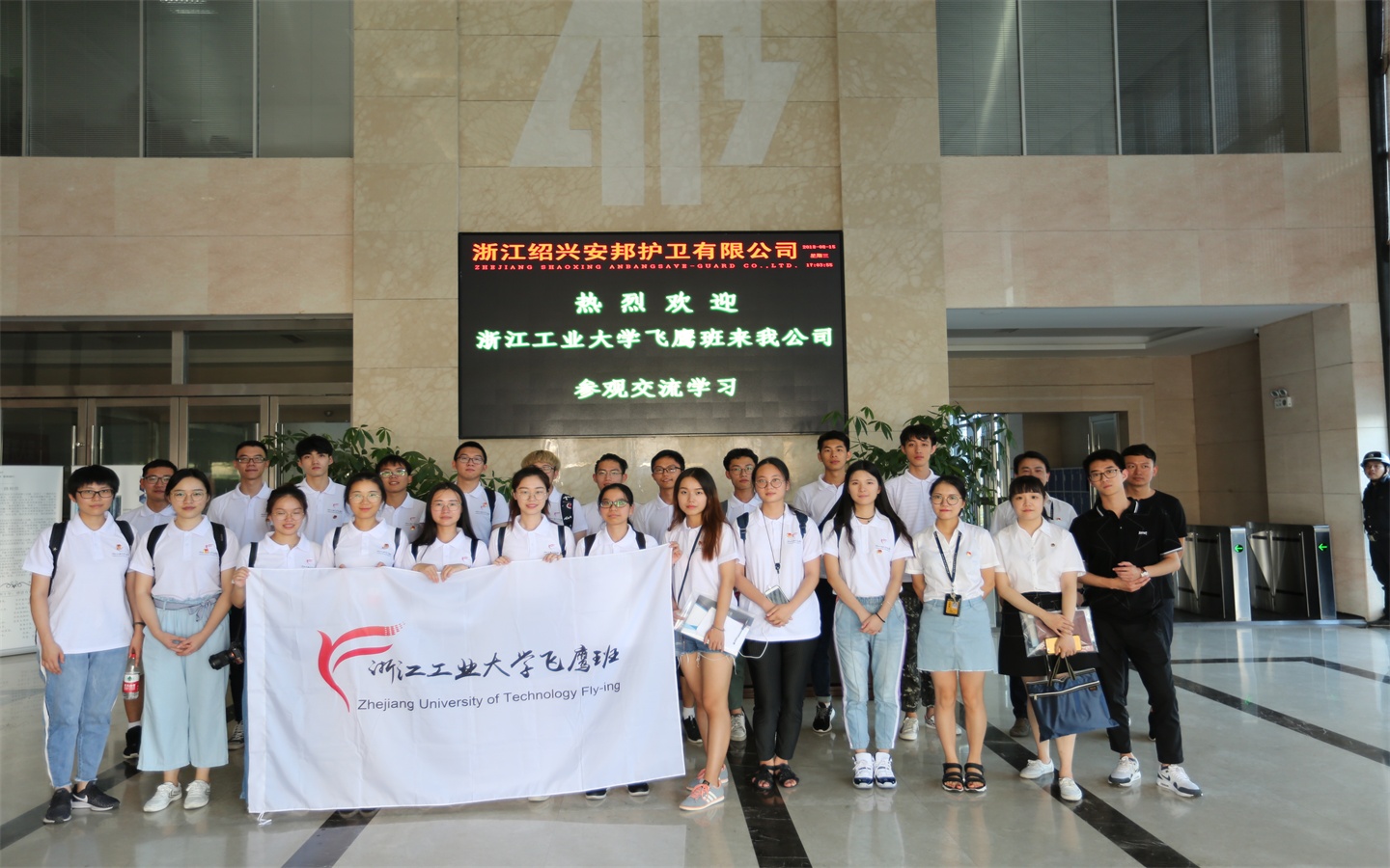 下午2点,浙江工业大学飞鹰班一行24人,在集团公司团委委员陈晓婷、傅炜的陪同下,来到绍兴公司。在座谈会开始之前,他们先到公司一楼大厅参观公司展板、海报,对公司情况有了初步的了解。
