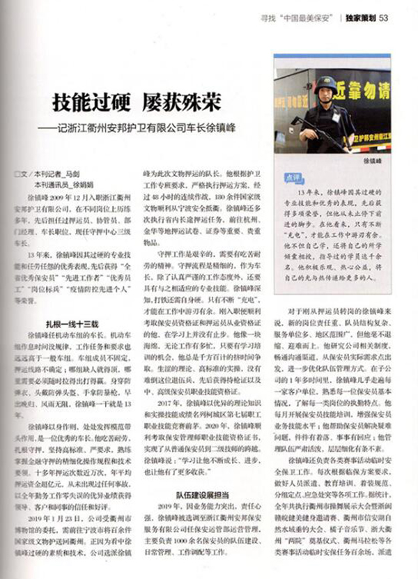 2019年1月23日,公司受衢州市博物馆的委托,需前往宁波市将数百件国家级文物护送回衢州。正因为看中徐镇峰过硬的素质和技术,公司选派徐镇峰为此次文物押运的队长。他根据护卫工作专班要求,严格执行押运方案,经过48小时的连续作战,180余件国家级文物顺利从宁波安全抵衢。徐镇峰还多次执行省内长途押运任务,前往杭州、金华等地押运试卷、证券等重要、贵重物品。