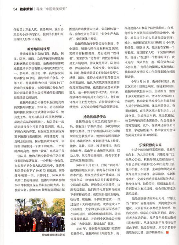 队伍建设展担当。2019年,因业务能力突出,责任心强,徐镇峰被选调至浙江衢州星辉保安服务有限公司任保安运管部运营管理,主要负责1000余名保安员的队伍建设、日常管理、工作调配等工作。